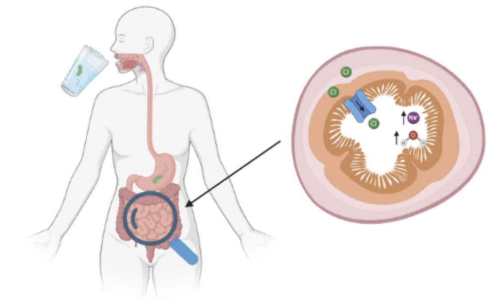 Once there is a flood of cAMP, these molecules communicate to downstream effectors such as protein kinase A (PKA). PKAs are a set of enzymes that put a phosphate group onto a protein they want to switch on, much like an alarm waking you up in the morning. In this case, PKA wakes up the protein, cystic fibrosis transmembrane conductance regulator (CFTR), an ion channel that, when awake, provides a highway for chloride ions to move into the intestine.[4] The high concentration of chloride ions in the intestine now disrupts the absorption of other essential ions, such as sodium. This ion imbalance causes the inside of the intestine to be salty, leading to an osmotic gradient.[8] Now, what happens when we eat something salty? We drink water. Similarly, when the intestine is rich in ions, water molecules travel to that site because of the osmotic gradient. Therefore, due to the excessive water in the small intestines, the once-solid stool becomes watery, causing diarrhea. Moreover, water loss within our intestinal cells causes large systemic dehydration in our bodies, deadly if not treated.[8]