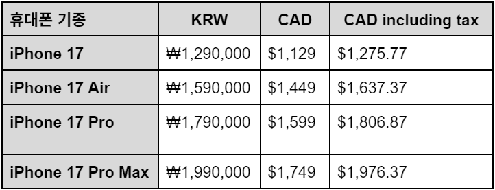 한국 & 캐나다 iPhone 가격 비교 (256GB 기준)